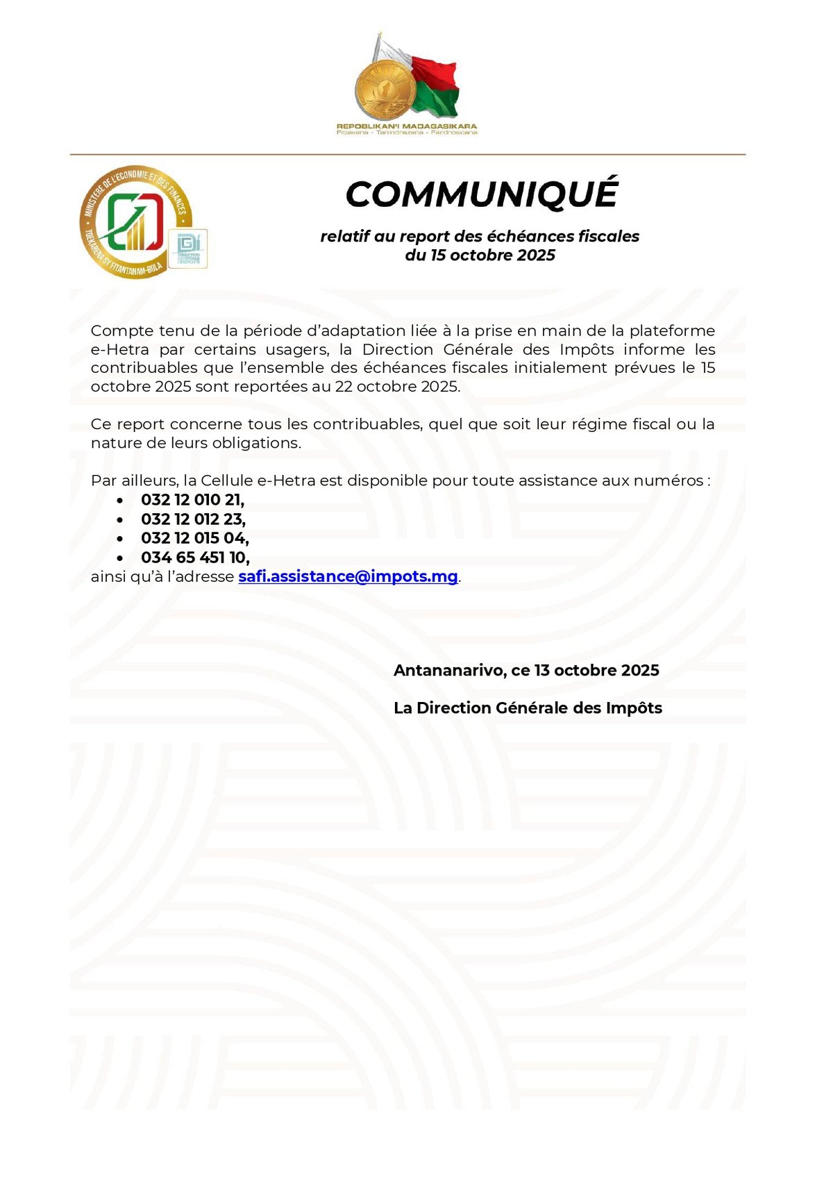 📍Source : Direction Générale des Impôts – Communiqué du 13 octobre 2025